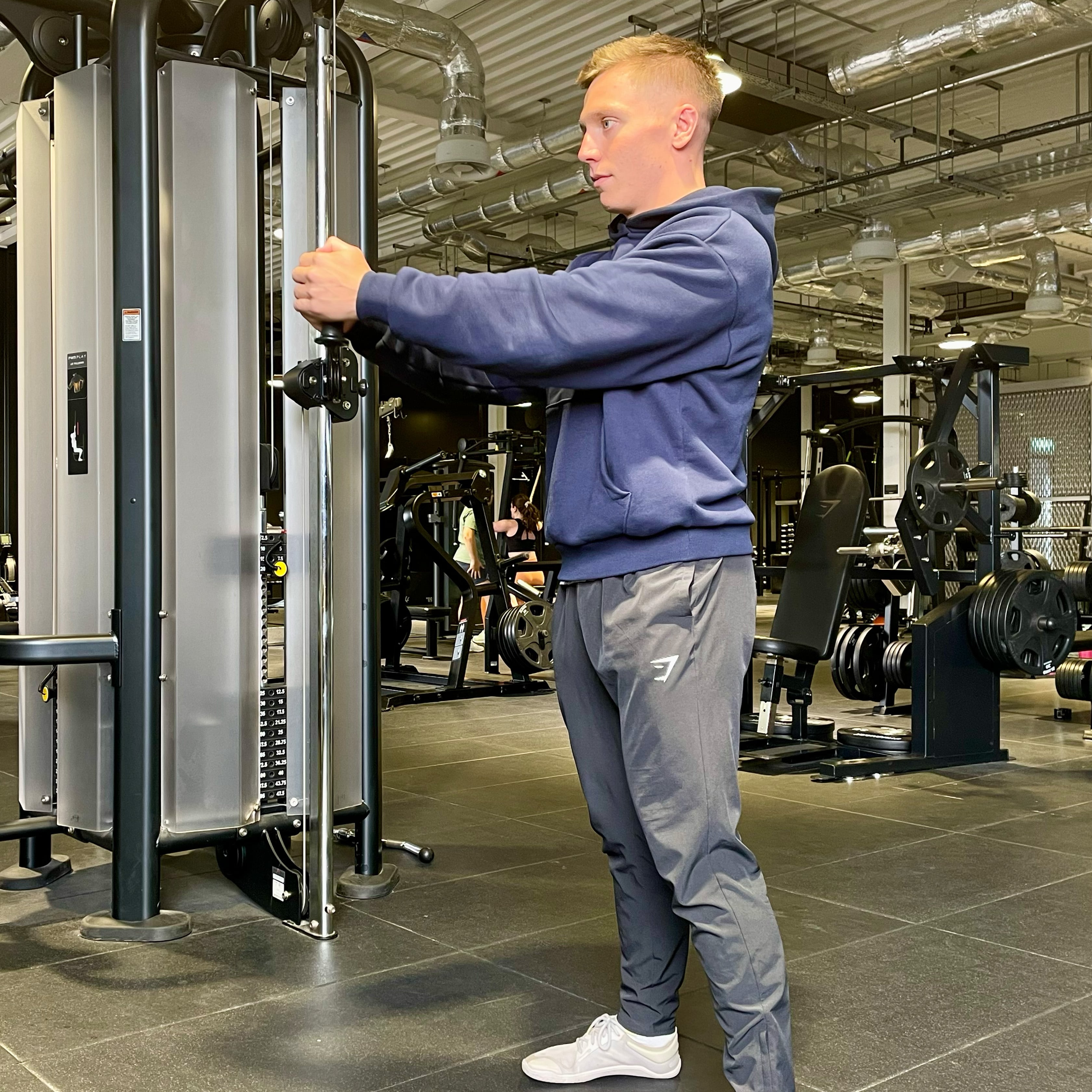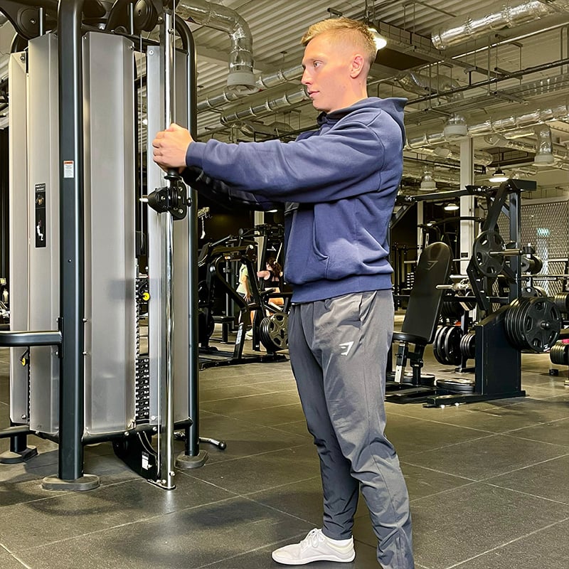 Move the cable to chest height and attach the handle attachment. Select a light weight on the cable stack.