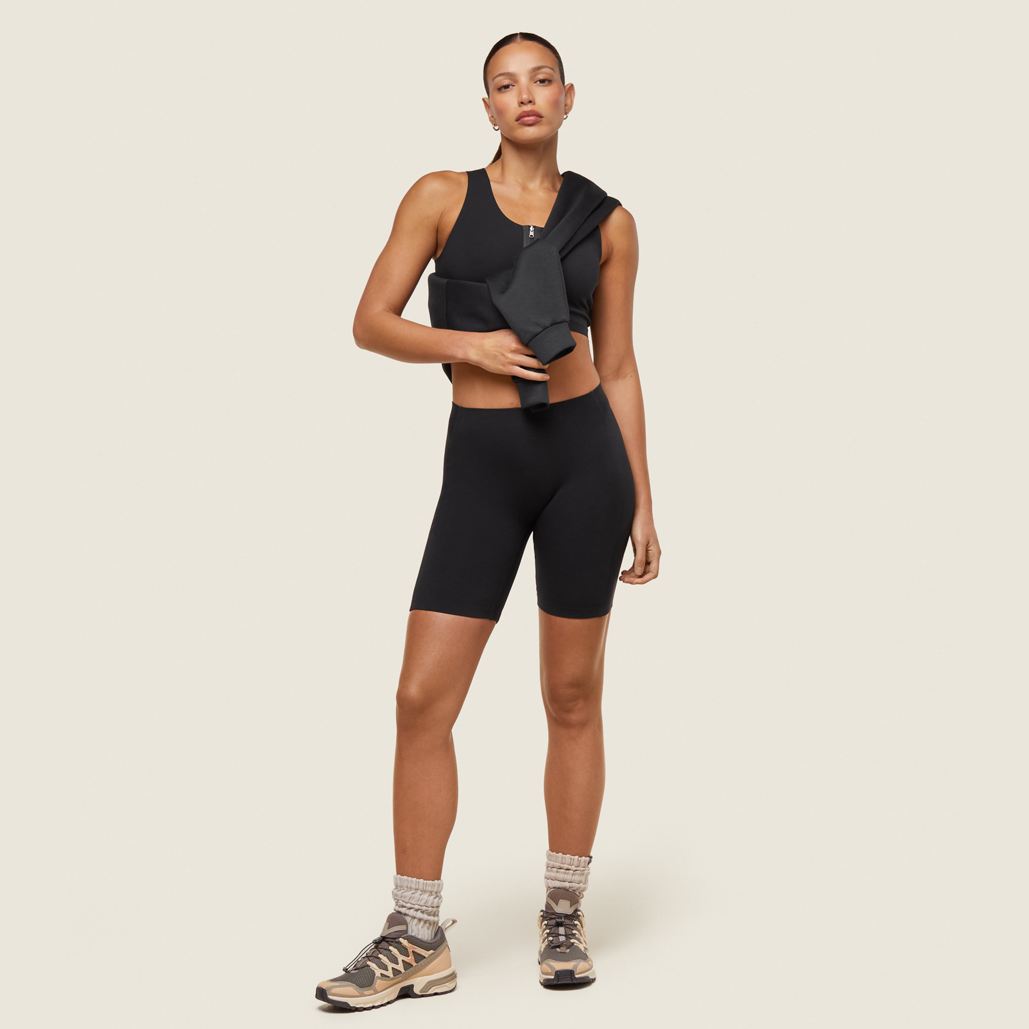 Stick to the roots and wear biker shorts where they first made their mark - the gym. Whether you're lifting, running, or flowing through yoga, sweat-wicking biker shorts offer comfort and support that moves with you. Wear your cycling shorts with a low-medium support sports bra if you’re hitting up a Pilates or Yoga studio. Reach for a high-support sports bra if you’re heading out for a run or to a HIIT class. Pair with a fitted zip-up jacket to complete the look. Sporty and chic.
