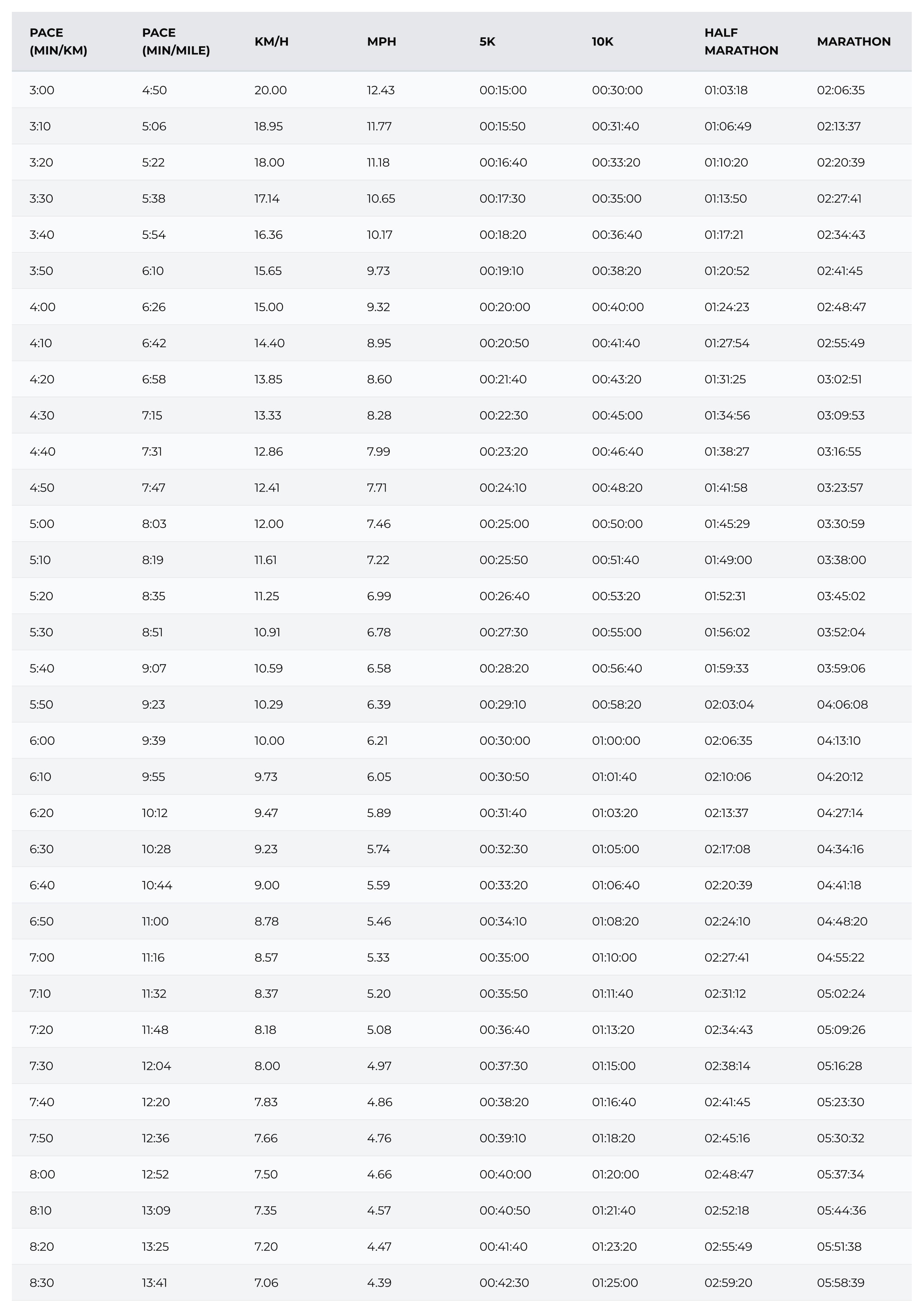 Once you’ve estimated a realistic target pace, use a running pace calculator chart to check whether your goal finish time aligns with your current fitness level. Only you know what’s realistic for where you’are at, and this way you can adjust expectations before race day and avoid starting faster than you can sustain.